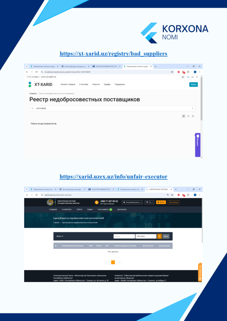 davlat xaridlari portallaridan foydalanish, e'lon berish va boshqalar,
